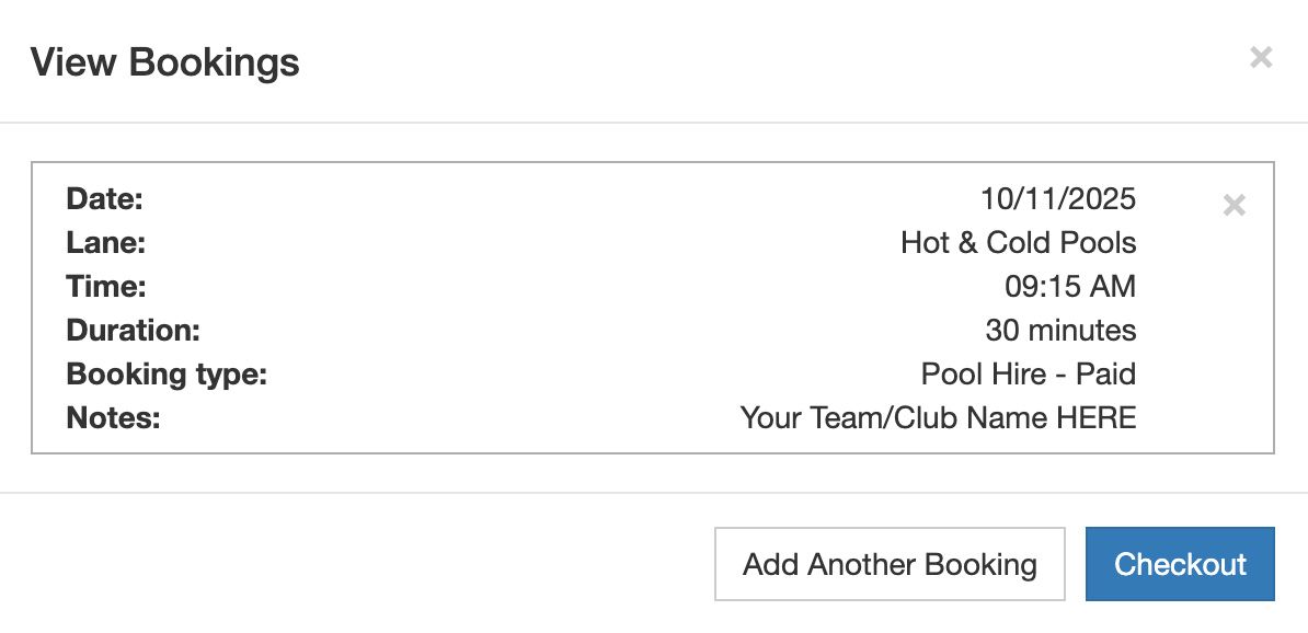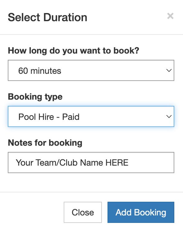 Please put the name of your team/club/school/group in the Notes for Booking field and click on Add Booking